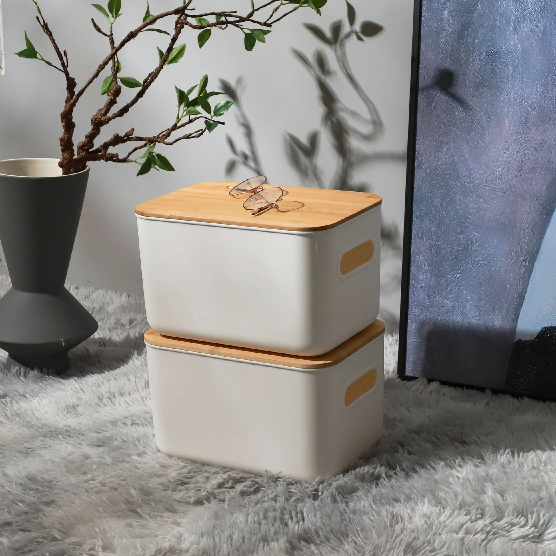 4 Packs Plastic Storage Bins with Bamboo lids responsibly designed bin provides storage in the bathroom for items such as makeup, skincare, soaps, lotions, hair and body care products, hair styling tools, and more. The coordinating lid with raised edges keeps items in place and provides additional catch-all storage on top of the bin, and the integrated handles make carrying and reorganization easy. This versatile lidded storage container is also great for use in the bedroom, closet, kitchen, pantry, office, craft room, nursery, and more. It can also be stacked for modular and customized storage in cabinets, under the sink, and on shelves. The durable plastic bin and natural bamboo lid stand up to everyday use, while the modern coconut white and natural wood finish match a variety of decor styles. Multi-purpose bin creates instant organization in compact spaces around the home.